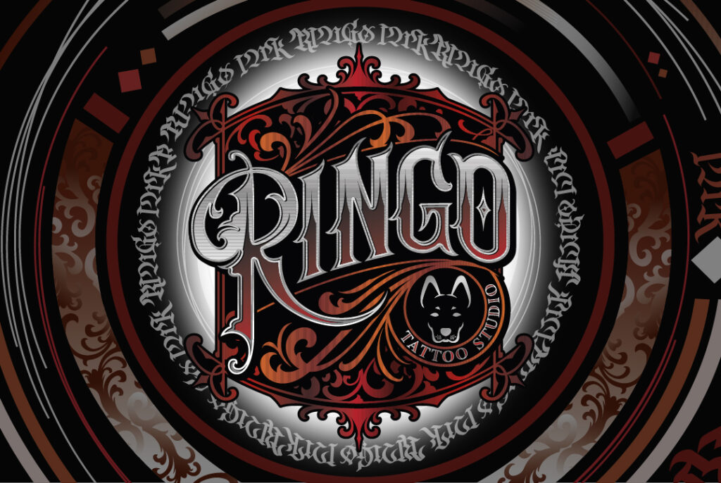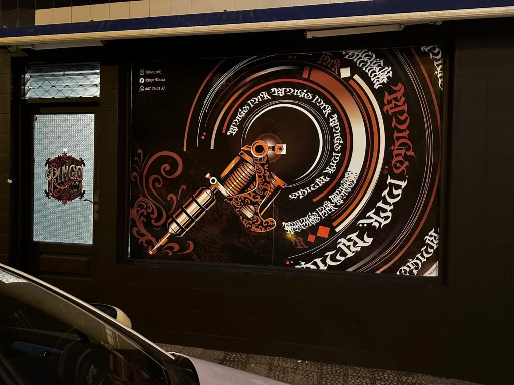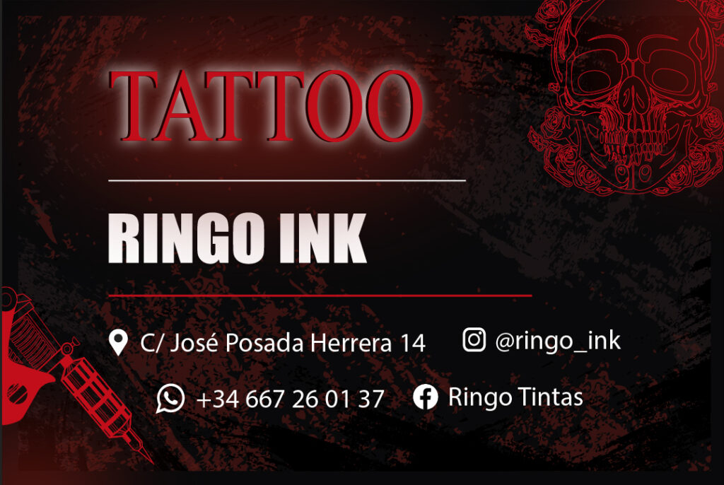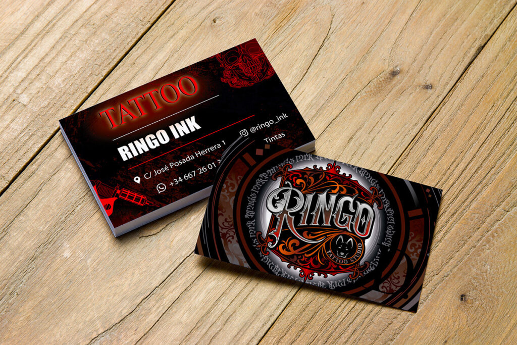 Este proyecto incluye el diseño de un mural decorativo y diseño de tarjetas de visita para el estudio de tatuajes Ringo INK (Torrelavega)